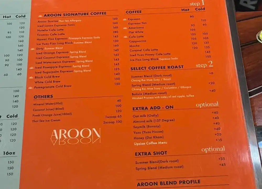 プロンポン駅近くのAroon Cafeのメニューコーヒーはノーマルなものと、特別な豆を使ったシグネチャーコーヒーがあります