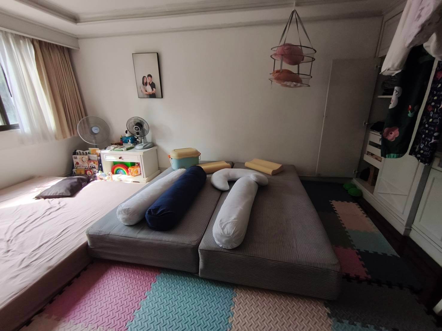 (The gray undersheet is for the right-side bed only.)